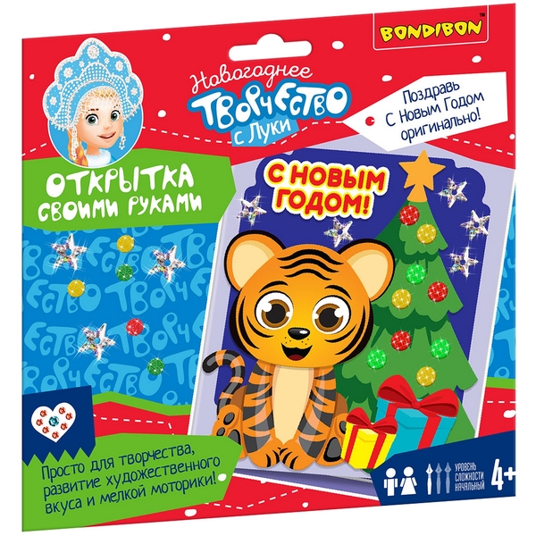 Новогодняя суета уже не за горами, так почему бы не подготовиться к ней заранее вместе с Bondibon? Встречайте набор для творчества - открытка своими руками (С Новым Годом!) с Луки. Серия «Новогоднее творчество с Луки» помогает развитию мелкой моторики и аккуратности, а также стимулирует развитие художественного вкуса. Вы соединяете все детали открытки по образцу или придумываете свой собственный дизайн – решать только Вам! В результате Вы получаете полноценный подарок своими руками с символом года, сделанный своими руками, внутри которого есть графы, чтобы оставить новогоднее пожелание. В набор входят основа для открытки, материалы для аппликации и украшения (бумажные, пластиковые элементы и наклейки ЭВА), двусторонний скотч. Все материалы безопасны и предназначены для детей от 4-х лет. Готовьтесь к Новому Году и развивайтесь одновременно – приобретайте набор для творчества BONDIBON. Открытка своими руками (С Новым Годом!) с Луки.