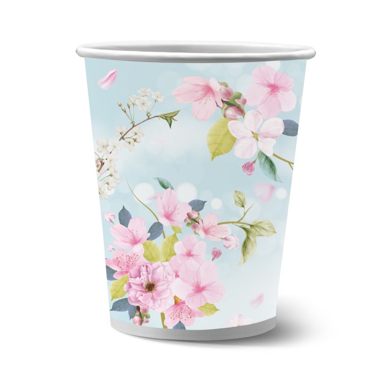 Набор бумажных стаканов «Яблоневый цвет» ? стильный элемент для украшения праздничного стола и пикника. На каждом стакане изображен стильный и лаконичный цветочный узор. Набор состоит из 6 бумажных стаканов объемом 250 мл, упакованных в пленку. Стаканчики изготовлены из плотного мелованного картона, который не промокнет во время праздника. Необычный дизайн тарелок с легкостью поднимет настроение гостям и поможет создать праздничную атмосферу. Одноразовая посуда – простое и стильное украшение для любого события.