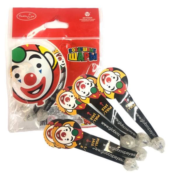 Светодиоды для шаров круглой формы с разноцветным свечением. Каждый светодиод зафиксирован на картонном держателе черного цвета, с другой стороны которого расположен декоративный элемент в виде головы клоуна. Для приведения в действие светодиода необходимо потянуть за голову клоуна. Праздничный аксессуар создаст веселую атмосферу на торжестве, приведет в восторг взрослых и детей. В наборе 5 светодиодов.