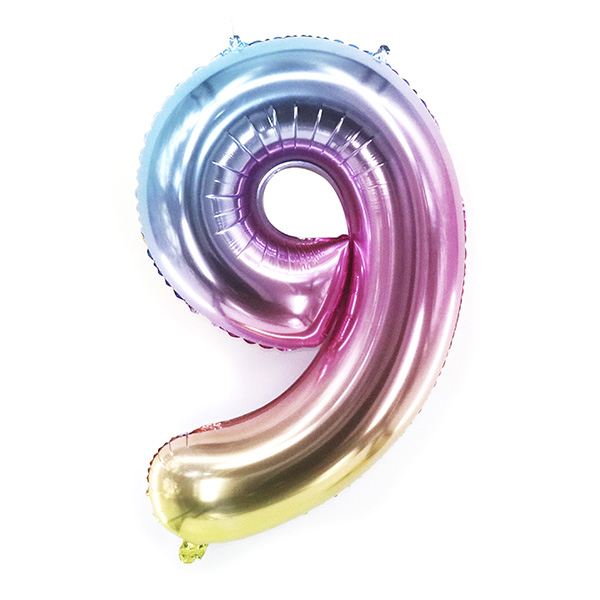 Воздушный шарик радужного оттенка в форме цифры 9 обязательно понравится гостям праздника как и самому виновнику торжества.