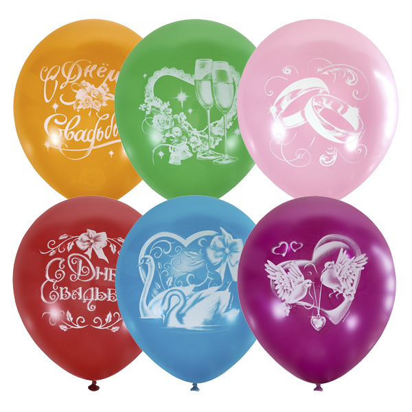 Ассорти шаров с разными рисунками для украшения свадебного помещения, лимузина. Воздушные шары типа пастель характеризуются нежными, пастельными цветами, они непрозрачны и имеют мягкий блик. Воздушные шары типа декоратор характеризуются обширной цветовой палитрой и в зависимости от цвета бывают полупрозрачными и матовыми.
