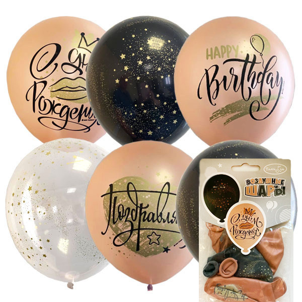 Набор шаров из латекса из коллекции «Rose Gold» с поздравительными надписями. Из такого набора можно составить оригинальную воздушную композицию или сделать их частью подарка имениннику. Прочные эластичные шарики представлены в наборе в трех цветах и украшены яркими звездочками и тематическими надписями. Надувать шары можно как воздухом, так и гелием. Фасовка по пять шаров в упаковке.