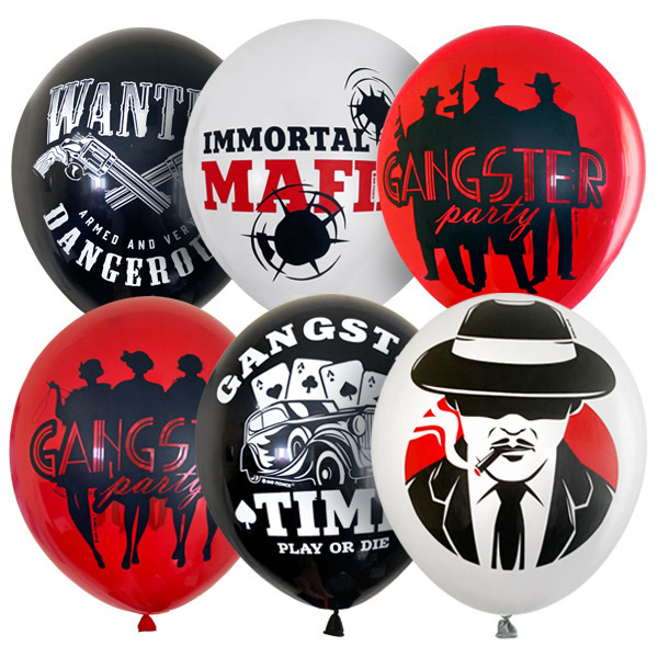 Стильные латексные шарики для гангстерской вечеринки, мальчишника или другого торжества. Шары красного, черного и белого цвета украшены оригинальными надписями и принтами. Надуваются при помощи воздуха или гелия. Шарики производства Латекс Оксидентл изготовлены из мягкого латекса, отличаются эластичностью и прочностью. Размер: 12"/30см. В состав набора входит 25 шариков.
