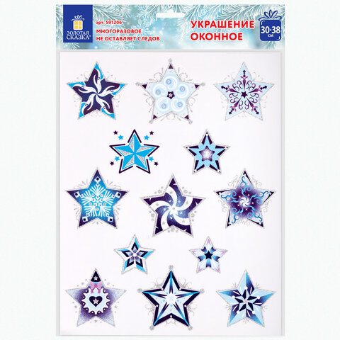Украшение для окон и стекла ЗОЛОТАЯ СКАЗКА – это отличный и недорогой способ украсить домашний или офисный интерьер к новогодним праздникам. Такой декор наполнит комнату волшебной атмосферой и подарит праздничное настроение. Изделие с изображением сине-голубых снежинок в виде звезд представляет собой наклейку, изготовленную из поливинилхлорида (ПВХ). Наклейка размером 30x38 см декорирована серебристым глиттером. Украшение предназначено для декорирования окон, зеркал, стекол и других ламинированных глянцевых поверхностей. Не оставляет клеевых следов и предназначено для многократного использования. Крепится к поверхности посредством статического эффекта. Украшение на белой картонной подложке упаковано в прозрачный полипропиленовый пакет на картонном подвесе.