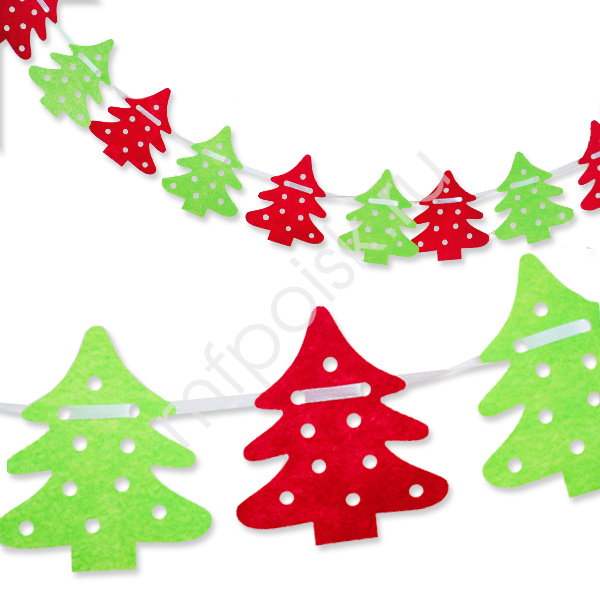 Яркая и эффектная новогодняя гирлянда из мягких фетровых элементов для украшения елки, интерьера или фотозоны, создания праздничной атмосферы дома, в школе, детском саду, развлекательном центре. Гирлянда-растяжка состоит из елочек красного и зеленого цвета. Украшение органично сочетается с другими тематическими праздничными аксессуарами – воздушными шарами, подвесками, дождиком. Длина растяжки - 135 см.