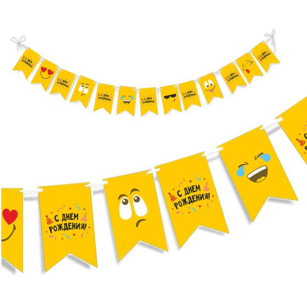Гирлянда «Эмоции смайл» украсит праздник и наполнит его яркими красками веселья и радости. На белой нити гирлянды расположено 13 желтых флажков, на каждом из которых нарисован улыбающийся смайл. Один задорно подмигивает, другой показывает язык, третий шлет воздушный поцелуй. А между смайлами размещаются флажки с надписью «С днем рождения». Гирлянда сделана из плотного картона, что позволяет использовать ее многократно. Длина гирлянды: 200 см.