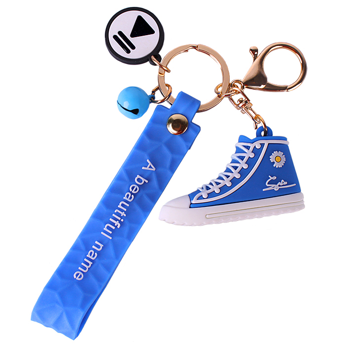Брелок "Кед" (6*2см ) с карабином и силиконовом ремешком с надписью"A beautiful name" и насадками. Ассорти цвет (желтый, розовый, синий, красный). Упаковка - п/э.