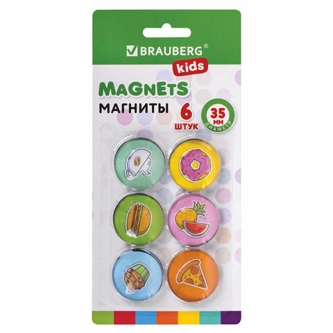 Круглые стеклянные магниты BRAUBERG KIDS с 3D-дизайном "Street Food" надежно прикрепляют листы бумаги к магнитно-маркерной поверхности досок, витрин, флипчартов и холодильников. Магниты круглой формы выполнены из полистирольного стекла. Диаметр магнита составляет 35 мм. 6 штук в комплекте. Надежно удерживаются на любой железной или стальной поверхности. Упаковка - блистер с европодвесом.