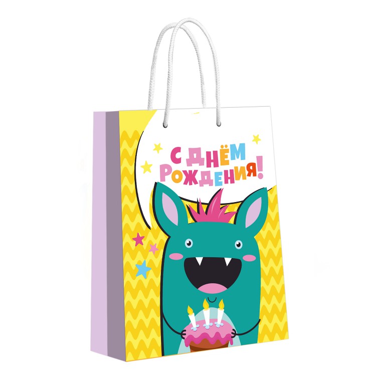 Большой подарочный пакет Монстрики «С Днем Рождения! » размером 335*406*155 мм создан для подарков на день рождения! В пакет отлично поместятся книги, настольные игры, наборы для опытов, сладости и другие игрушки весом до 2,5 кг. При оптовом заказе пакеты отгружаются в упаковках по 10 штук и в коробках до 100 шт. Пакет гармонично дополнит подарки из нашего магазина, поднимет настроение и сделает праздник запоминающимся. Подарочный пакет отличается вместительностью, удобными ручками, ярким дизайном и качественной мелованной бумагой с ламинацией.