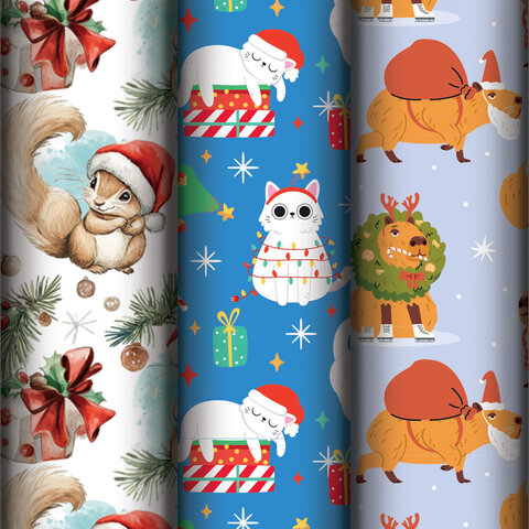 Бумага упаковочная новогодняя НАБОР 3 шт., "X-mas animals", 70х100 см, 3 дизайна, ЗОЛОТАЯ СКАЗКА, 592610