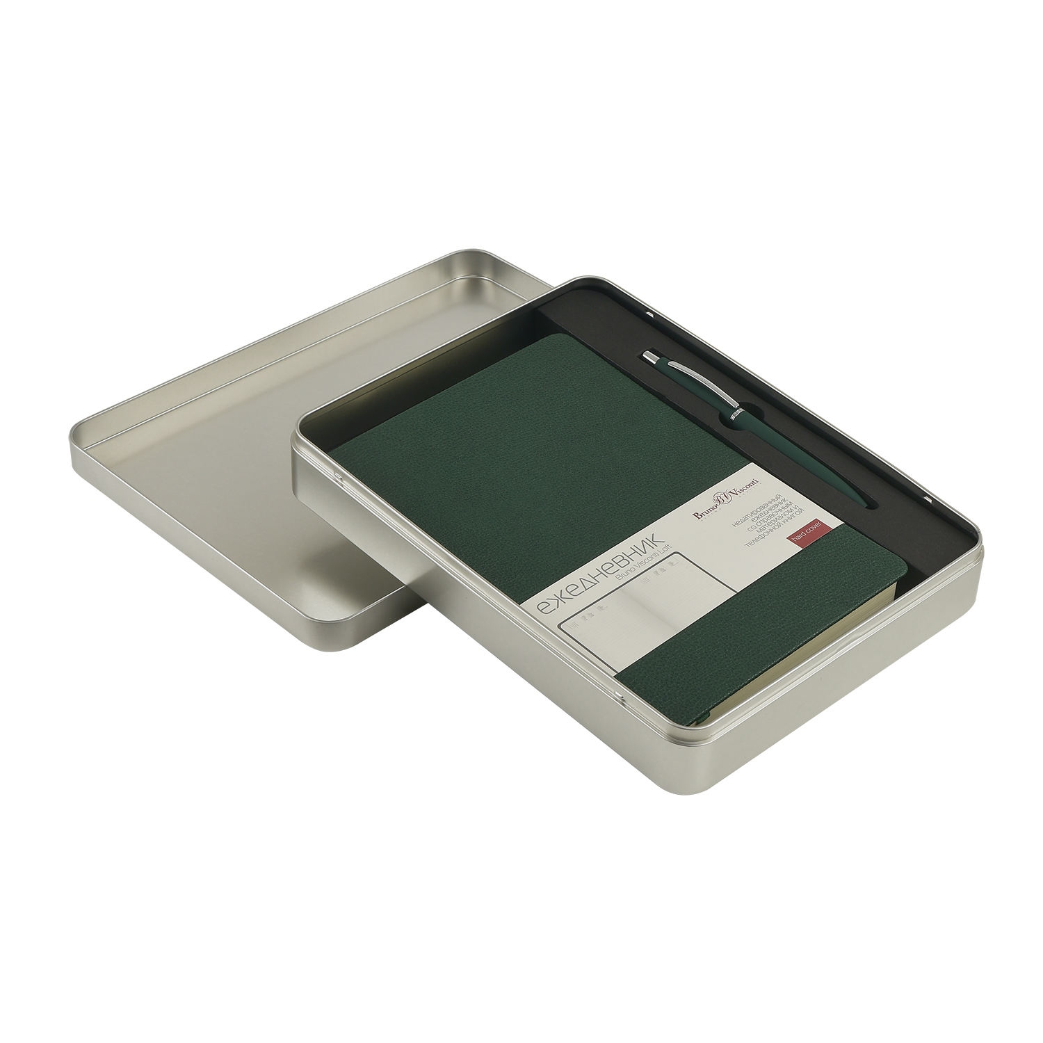 НАБОР ПОДАРОЧНЫЙ ЕЖЕДНЕВНИК А5 "MEGAPOLIS LOFT" (ЗЕЛЕНЫЙ) И РУЧКА "SAN REMO" В СЕРЕБР.МЕТАЛ.КОРОБКЕ