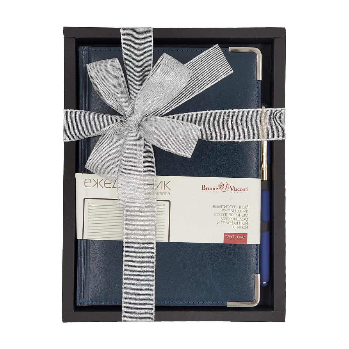 Набор подарочный Bruno Visconti "PERSONA" (ежедневник и ручка) - отличное решение для подарка друзьям, коллегам, партнерам, руководителю. Недатированный ежедневник «PERSONA» формата A5 выполнен в твердой обложке из высококачественной экокожи и прошит тонкой шелковой нитью по периметру в тон. Благородство в облик ежедневника добавляют металлические уголки и серебряный срез. На контрасте с темным цветом обложки блок состоит из листов бежевого цвета плотностью 70 г/кв.м. Раздел планирования разлинован на графы с указанием времени с интервалом в один час. В дополнение к нему блок содержит страницу для персональных данных, справочную информацию на 13 страницах, телефонную книгу на 19 страницах и закладку-ляссе для удобства навигации. К ежедневнику прилагается шариковая подарочная ручка «Monaco» от Bruno Visconti. В ней нет ничего лишнего, но она привлекает к себе внимание. Несмотря на увеличенный диаметр корпуса - 12 мм, ручка изящна благодаря плавным линиям. Чернила Dokumental (Германия) и швейцарский пишущий узел Premec гарантируют качество и долгий срок службы.