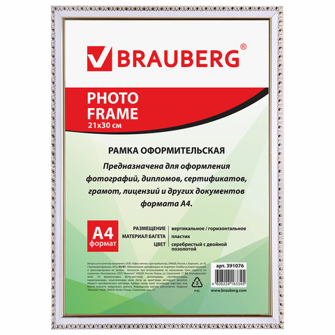Рамка BRAUBERG "HIT5" для оформления фотографий, дипломов, сертификатов, грамот, лицензий и других документов формата А4 (21х30 см) будет гармонично смотреться в любом интерьере - дома и офисе, учебных учреждениях и магазинах, салонах и предприятий и др. Выполнена из пластика белого цвета с двойной позолотой, за счет чего отлично впишется в домашний и деловой интерьер. Имеется возможность вертикального и горизонтального подвеса. Ширина багета - 16 мм. Аккуратный вид достигается благодаря стеклянной вставке. Микрогофрокартон обеспечивает плотное прилегание и отсутствие в будущем деформации содержимого в рамке. Термоусадочная пленка гарантирует сохранность рамки при транспортировке, отсутствие сколов и потертостей.