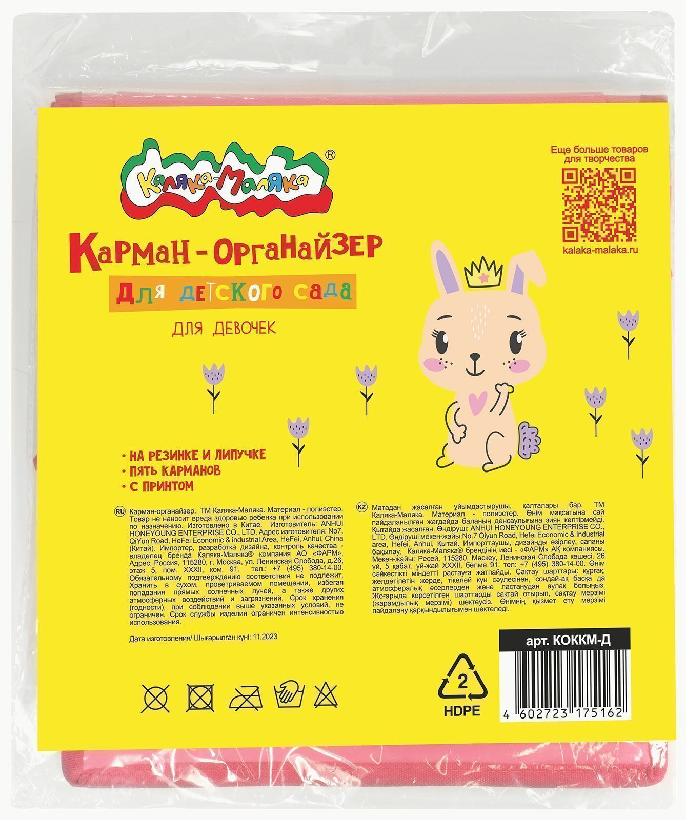 Кармашки-органайзер в шкафчик для детского сада Каляка-Маляка 5 карманов 83x24 см, розовый