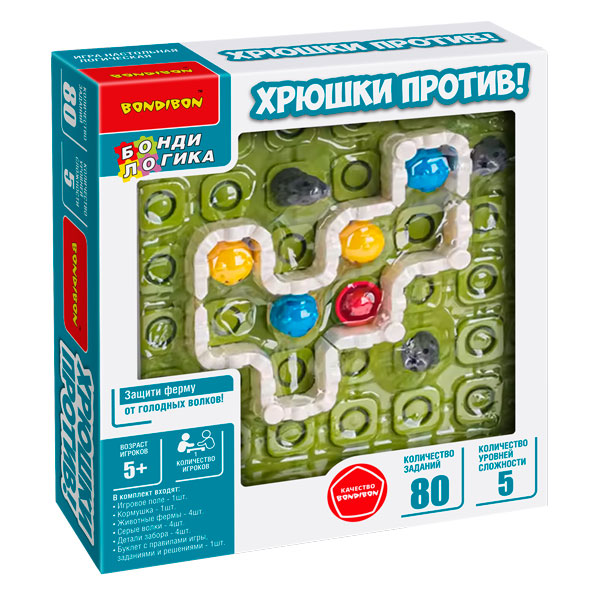 Головоломка в виде фермы с цветными фишками-зверюшками увлечет детей на долгие часы! Настольная логическая игра ХРЮШКИ ПРОТИВ! серии БондиЛогика от Bondibon содержит 80 заданий от простых с подсказками до суперсложных. Выберите задание и установите фигурки животных и кормушку на игровое поле, как показано на картинке. Ваша задача – расположить детали забора так, чтобы отделить обитателей фермы и кормушку от волков. Поросенок, другие животные фермы и кормушка должны быть огорожены со всех сторон. Зоны безопасности могут быть разного размера и располагаться отдельно друг от друга. Волки не должны быть со всех сторон огорожены заборами, хотя бы одна сторона всегда должна оставаться открытой. Игра ХРЮШКИ ПРОТИВ! от Бондибон - отличный подарок, который поможет развить логику, пространственное мышление и внимание. В набор входят: игровое поле, кормушка, 4 животных фермы (свинка, цыпленок, бычок, хомяк), 4 волка, 4 детали забора, буклет. Количество игроков 1 5 уровней сложности Возраст 5+