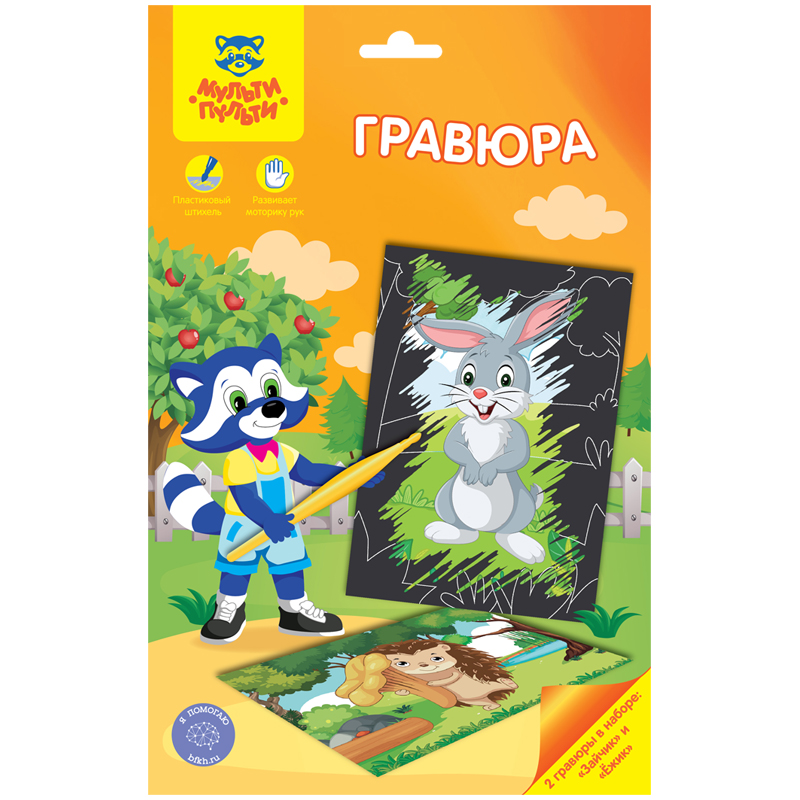 Гравюра – прекрасное средство развития воображения, аккуратности и терпения, а также мелкой моторики рук. Ребенку понравится создавать яркую картинку с помощью безопасного инструмента. Набор может стать превосходным подарком. В наборе: 1. Основа - заготовка с нанесённым контуром. Она представляет собой яркую картинку, покрытую слоем черного цвета. 2. Специальный штихель – безопасный для малыша пластмассовый инструмент. Набор идеально подходит для первого опыта гравирования. Если с нажимом провести штихелем по листу картона, то черный слой легко снимется и под ним проступит яркий рисунок. Штриховать картинку можно, как обозначая отдельные детали и героев рисунка, так и всю целиком.