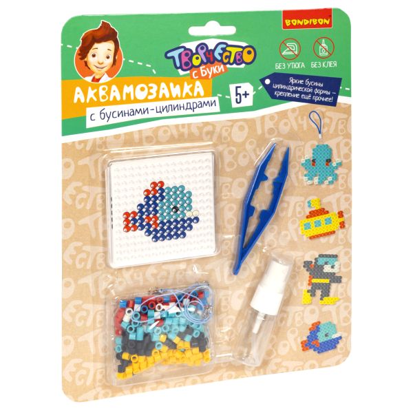 Создайте яркую подвеску-брелок своими руками вместе с набором для творчества аквамозаика «Подводное путешествие» от Bondibon. Серия Творчество с Буки развивает художественный вкус, мелкую моторику и воображение ребенка. Поместите цветную схему под трафарет и выложите на него бусины, смочите водой из распылителя, дайте высохнуть. Снимите получившуюся фигурку и положите ее на чистый лист бумаги до полного высыхания. Прикрепите подвеску, чтобы получился брелок. Готово! В результате у Вас получатся уникальные персонажи подводного мира: рыбка, подводная лодка, осьминог и аквалангист. В комплекте: цветные шарики, пластиковая основа, распылитель воды, карточки-трафареты, пинцет и подвески для брелоков. Рекомендуемый возраст 5+. Набор для творчества аквамозаика «Подводный мир» от Bondibon – это отличный способ для ребенка провести время с интересом и пользой и создать удивительную поделку своими руками.