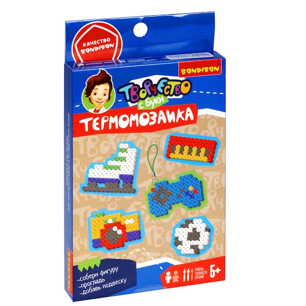 С набором для творчества ТЕРМОМОЗАИКА от Bondibon легко создать необычные брелоки – предметы, связанные с любимым хобби! Кроме развития фантазии, с помощью бусин дети учатся распознавать цвета, обращаться с мелкими предметами, различать формы и считать. Термобусины необходимо собрать по трафарету на форме-планшете и прогладить через кальку утюгом. Обработка горячим расплавит бусинки и скрепит их между собой. Фигурка остынет и с ней можно играть! Или сделать чудесный брелок, прикрепив подвеску. В комплекте: набор термобусин, планшет, калька, пинцет, 5 цветных схем – фотоаппарат, футбольный мяч, джойстик, синтезатор, подвески для брелоков. Уровень сложности – средний. Возраст 5+ Набор для творчества ТЕРМОМОЗАИКА " ХОББИ " серии Творчество с Буки – это отличный способ для ребенка провести время с интересом и пользой и создать удивительную поделку своими руками. Дарите правильные подарки от Bondibon юным творческим личностям!