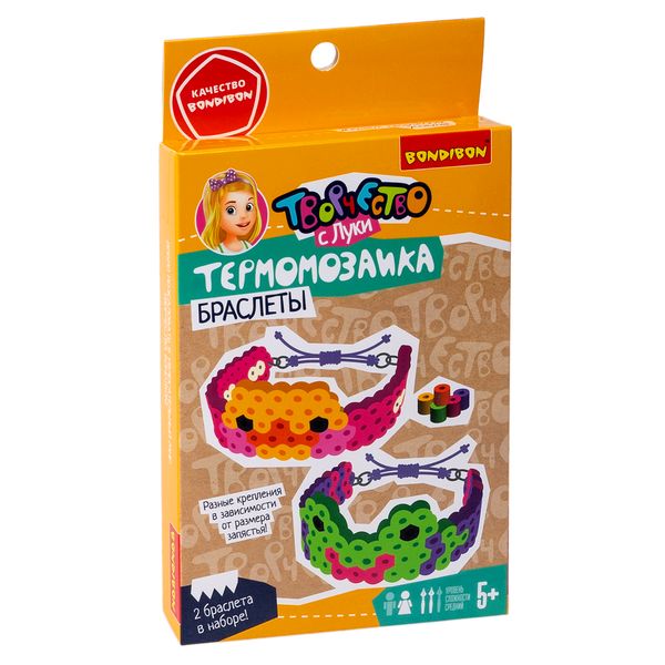 Малыши придут в восторг от ярких украшений из бусин, сделанных своими руками! Bondibon представляет набор для творчества ТЕРМОМОЗАИКА ЛЯГУШКА И УТОЧКА для создания двух браслетов из серии Творчество с Луки. Делать украшения очень легко и интересно! Поместите схему под планшет и выложите бусины. Помогите малышу прогладить изображение. Дайте аппликации немного остыть и медленно согните ее в дугу. Примерьте и закрепите на изделии удобную застежку. Вы можете выбрать замочек или регулируемую нить. Браслет готов! Дополните украшением модный образ или подарите оригинальный подарок друзьям. Увлекательное занятие поможет ребенку развить творческий потенциал, мелкую моторику, усидчивость и аккуратность. В комплект входит: набор термобусин, планшет, калька, цветная схема, пинцет, крепления для браслета. Возраст 5+ Развивайте фантазию и познавательные способности детей с набором для создания 2 браслетов ЛЯГУШКА И УТОЧКА от Бондибон! Соберите все ТЕРМОМОЗАИКИ из серии Творчество с Луки!