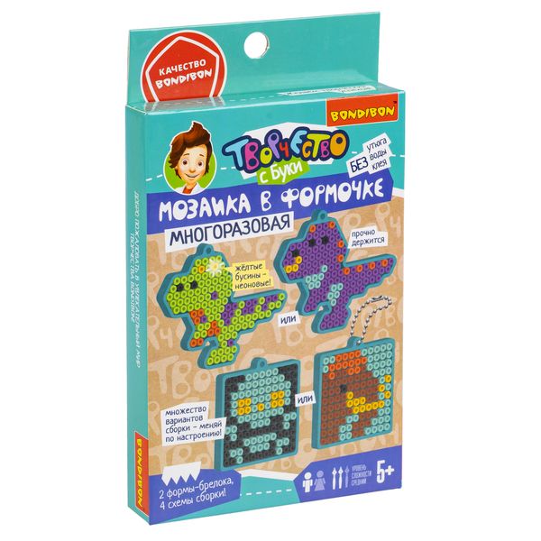 Порадуйте ребенка набором для творчества МОЗАИКА ДИНОЗАВРЫ, МАМОНТ, ЧЕРЕП неоновые бусины серии Творчество с Буки от Bondibon. Создавайте яркие брелоки с помощью двух многоразовых форм и меняйте рисунок по настроению! Выберите одну из 4 схем сборки и выложите бусины на платформе. Вам не понадобятся утюг или клей! Бусины прочно держатся в формах. Прикрепите подвеску. Ваш модный аксессуар готов! Зарядите его на солнце или под лампой, ведь в темноте желтые неоновые бусины светятся! Набор для любимого хобби многоразовый, и бусины легко снимаются. Проявите фантазию и придумайте новые идеи для брелоков. Такой увлекательный процесс поможет развить мелкую моторику, внимание, усидчивость и воображение. В набор входят: более 400 бусин, 2 формы, 4 схемы сборки, пинцет, подвески для брелоков. Возраст 5+ Соберите коллекцию мозаик для детей от Бондибон и создавайте своими руками красочные аппликации, картины, фигурки и украшения из бусин!