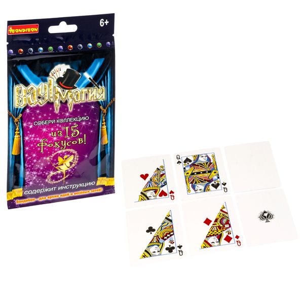 Четыре дамы и четыре туза ВАУ! Магия Bondibon – набор фокусника для детей, которые хотят услышать восхищенное ВАУ от своих друзей. Игрушка развивает мелкую моторику, фантазию, познавательные и творческие способности ребенка. Четыре дамы превращаются в четырех тузов, а затем исчезают на глазах зрителей. Удивительно? Конечно, это же магия! А так же ловкость и внимательное чтение инструкции. В комплект входят 6 специальных карт и наглядное руководство по проведению фокуса. Игровой набор дополняет коллекцию из 15 фокусов. Возраст 6+.