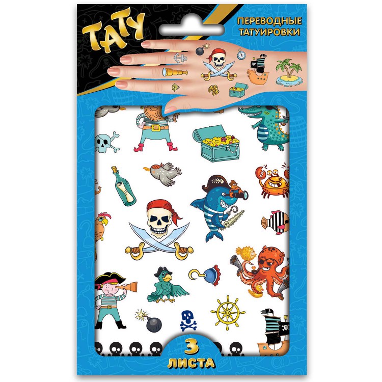 Создайте сияющие образы с помощью светящихся наклеек-татуировок «Пираты»! Набор детских татуировок состоит из 3 листов с наклейками. Светящиеся татуировки держатся на коже от 3 до 5 дней, легко наносятся и отклеиваются, не раздражают кожу и быстро заряжаются от света. Временные детские татуировки принесут ребенку радость, дополнят образ на вечеринку или праздник. Нанести татуировку очень просто: выберите понравившуюся картинку, снимите прозрачную пленку и приложите рисунок лицевой стороной на сухой участок кожи. Затем плотно прижмите тату смоченной губкой и подождите 30 секунд. Украшение готово! Для удаления татуировки нанесите на картинку крем или масло и смойте водой через несколько секунд.