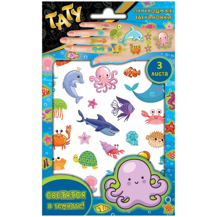 Наклейки - татуировки светящиеся "Подводный мир", 3 листа
