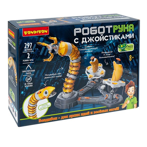 Биомеханическая техника из фантастических фильмов и мультиков теперь реальность! Набор для опытов ГИБКАЯ РОБОТ-РУКА с джойстиками и 2 режимами игры серии Робототехника с Буки от Bondibon позволяет ребенку собрать своими руками игрушку-манипулятор и управлять ее движениями, напоминающими движения животных! При помощи джойстиков Вы сможете сгибать руку под разными углами и создавать множество вариантов движений в диапазоне 360 градусов. Используйте кнопки на джойстиках для открытия, закрытия и вращения захватывающего элемента. В режиме клешня рука обходит препятствия и захватывает предметы. Режим змейка веселый и творческий. Покормите умного питомца креветкой, потанцуйте и придумайте свои сценарии игры! ГИБКАЯ РОБОТ-РУКА от Бондибон поможет детям получить интересные инженерные и конструкторские навыки, развить моторику и фантазию. В набор входят: 297 деталей, инструкция. Батарейки не требуются. Дополнительно могут понадобиться: кусачки, отвертка, маркер, рулетка или линейка. Возраст 8+