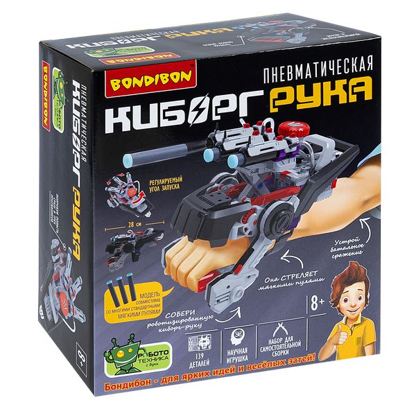 Потрясающий проект инженеров и специалистов по робототехнике, позволяющий детям самостоятельно собрать пневматическое игрушечное оружие, развивать навыки конструирования и конструкторские знания. ПНЕВМАТИЧЕСКАЯ КИБОРГ-РУКА от Bondibon это набор для самостоятельной сборки, состящий из более чем 130 деталей! Помощником в сборке станет цветная пошаговая инструкция с играми и экспериментами на тему пневматических механизмов. Сообранное киборг-оружие наденьте на руку, закрепите на запястье, прицельтесь и запускайте пули. ПНЕВМАТИЧЕСКАЯ КИБОРГ-РУКА от Бондибон подходит для руки любого размера, её пусковая платформа поднимается вверх, радиус стрельбы регулируется. Этот набор развивает инженерное мышление и понимание принципов работы пневматических механизмов. В набор входит: более 130 деталей, 6 мягких пуль, браслет с держателем патронов, инструкция по сборке. Работает без батареек. Дополнительно понадобятся (не входят в набор): диагональные кусачки или ножницы, крестовая отвертка. 8+