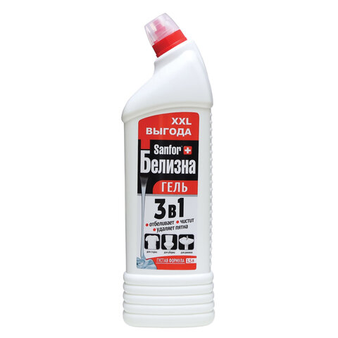 Средство для отбеливания и чистки тканей SANFOR "Белизна" 3 в 1 для отбеливания и удаления пятен при стирке, а также для дезинфекции и чистки сантехники и труб. Многофункциональное средство комплексного действия с хлором.Состав: больше 5%, но меньше 15% гипохлорит натрия; меньше 5%: АПАВ или мыло на основе натуральных жирных кислот, НПАВ, щелочь, ароматизирующая добавка.Способ применения: • Для замачивания перед стиркой (белое белье с общим загрязнением) приготовить раствор – 30 г средства на 5 л воды (20-25 °С). Выдержать белье в растворе 10 минут, прополоскать, далее стирать обычным способом. • Для отбеливания и удаления пятен с белых изделий из хлопка, льна – приготовить раствор 30 г средства на 5 л воды (40-45 °С). Выдержать изделия в растворе 30 минут, тщательно прополоскать и стирать обычным способом. • Чистка ванн, раковин, унитазов – нанести средство на поверхность, почистить губкой или щеткой и смыть водой. • Напольные, настенные покрытия, кафельные, пластиковые и эмалированные поверхности мыть раствором – 60 г средства на 5 л воды, смыть водой. • Акриловые поверхности мыть раствором – 20 г средства на 5 л воды, смыть водой. • Для чистки стоков налить средство (250 мл) в водосток, выдержать 60 минут (или оставить на ночь), смыть водой.
