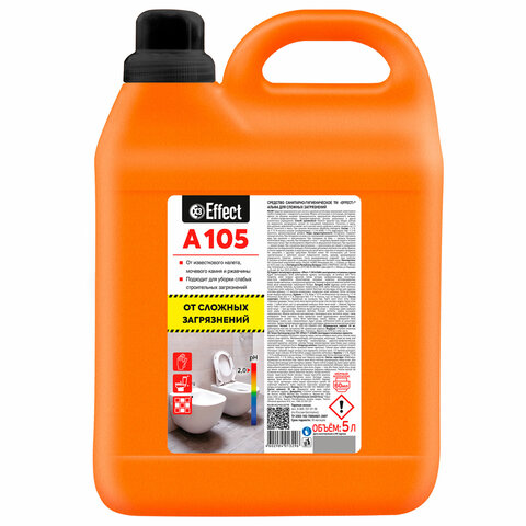 Средство EFFECT "Alfa 105" предназначено для чистки и удаления устойчивых загрязнений, известкового налета, мочевого камня и ржавчины с поверхности унитазов и плитки. Можно использовать в гостиницах, ресторанах, офисах, на объектах пищевой промышленности, предприятиях общественного питания, в лечебно-профилактических, санаторно-курортных, детских, дошкольных и других аналогичных учреждениях.Рекомендации по применению: нанесите средство под ободок унитаза по окружности, распределить щеткой по очищаемой поверхности. Для удаления загрязнений в нижней части унитаза налейте средство в воду и оставьте на 1 минуту, затем смойте. Плотно закрутите колпачок. При сильном загрязнении обработку повторите. Используйте регулярно для поддержания чистоты и свежести туалета. Для ежедневной уборки полов, стен, керамических поверхностей в ванной комнате используйте 0,5-3% раствор.Состав: более 30% вода, более 5%, но менее 15% кислота соляная ингибированная, менее 5% НПАВ, менее 5% амфотерное ПАВ, менее 5%: краситель, ароматизирующая добавка. Значение pH – 2.Меры предосторожности: будьте осторожны! Средство раздражает глаза, органы дыхания и кожу. Следует избегать контакта средства с кожей и глазами. В случае попадания в глаза немедленно промыть их большим количеством воды и обратиться за медицинской помощью. При контакте с кожей немедленно смыть большим количеством мыльного раствора. При вдыхании выйти на свежий воздух. При работе использовать щетку и резиновые перчатки. Не глотать! При случайном проглатывании выпить большое количество воды и немедленно обратиться к врачу. Не применять для чистки чувствительных к действию кислот поверхностей (мрамор, акрил, эмаль). Не смешивать с другими средствами.Условия хранения: хранить в плотно закрытой упаковке, отдельно от пищевых продуктов, в недоступных для детей местах. Средство замерзает, после размораживания сохраняет свои свойства. Срок годности – 24 месяца. По истечении срока годности средство утилизируют как бытовой отход.