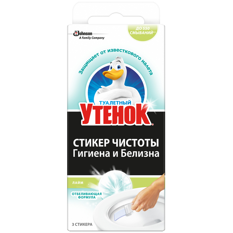 Туалетный Утенок Стикер чистоты Гигиена и Белизна - Лайм. Средство для очистки унитаза. Чистит и освежает. Удобно и гигиенично. Содержит отбеливающий компонент (активный хлор), который эффективно очищает и отбеливает поверхность унитаза, а также обладает антимикробным действием. Благодаря очистителю Туалетный утенок "Стикер чистоты" на поверхности унитаза образуется защитный слой, который препятствует образованию минеральных отложений, являющихся очагами скопления микробов. Очиститель крепится внутри унитаза ниже ободка на сухую поверхность. Обладает приятным ароматом, полностью растворяется в воде. Упаковки стикеров хватает более, чем на 550 смываний. Способ применения 1. Надорвите пакетик, извлеките стикер и отогните бумажную защиту с одной из ее сторон. 2. Держа за отогнутую бумажку, СИЛЬНО ПРИЖМИТЕ стикер к внутренней сухой поверхности унитаза и разгладьте по краям. 3. Снимите оставшуюся бумагу. Старайтесь закреплять стикеры так, чтобы их сложно было заметить. Стикер полностью растворяется. После израсходования замените на новый. Сохраняйте внешнюю упаковку с рекомендациями по применению до окончания использования.