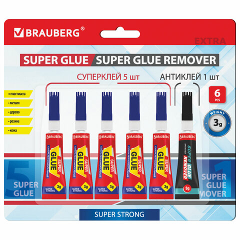 Набор "Клей моментальный Суперклей 5 шт. + "Антиклей 1 шт." BRAUBERG EXTRA незаменим в быту! Применяется для склеивания изделий из пластмассы, дерева, резины, кожи и других материалов. Несмотря на небольшой объем, клей экономно расходуется благодаря высокой плотности. Обладает быстрым схватыванием – всего 5 секунд! Склеивает прочно и надежно. Не растекается, не оставляет видимых следов после высыхания. Водостойкий, термостойкий, устойчив к органическим растворителям. Heпригоден для склеивания посуды, контактирующей с пищей.Антиклей предназначен для удаления как свеженанесенного, так и затвердевшего моментального клея с большинства материалов. Может применяться для удаления следов наклеек, пятен от чернил и маркеров. С помощью антиклея можно также обезжирить или очистить загрязнённые поверхности перед склеиванием.Рабочая температура: от -30 °С до +80 °С.Вес нетто – 3 г, упаковка – блистер с европодвесом.