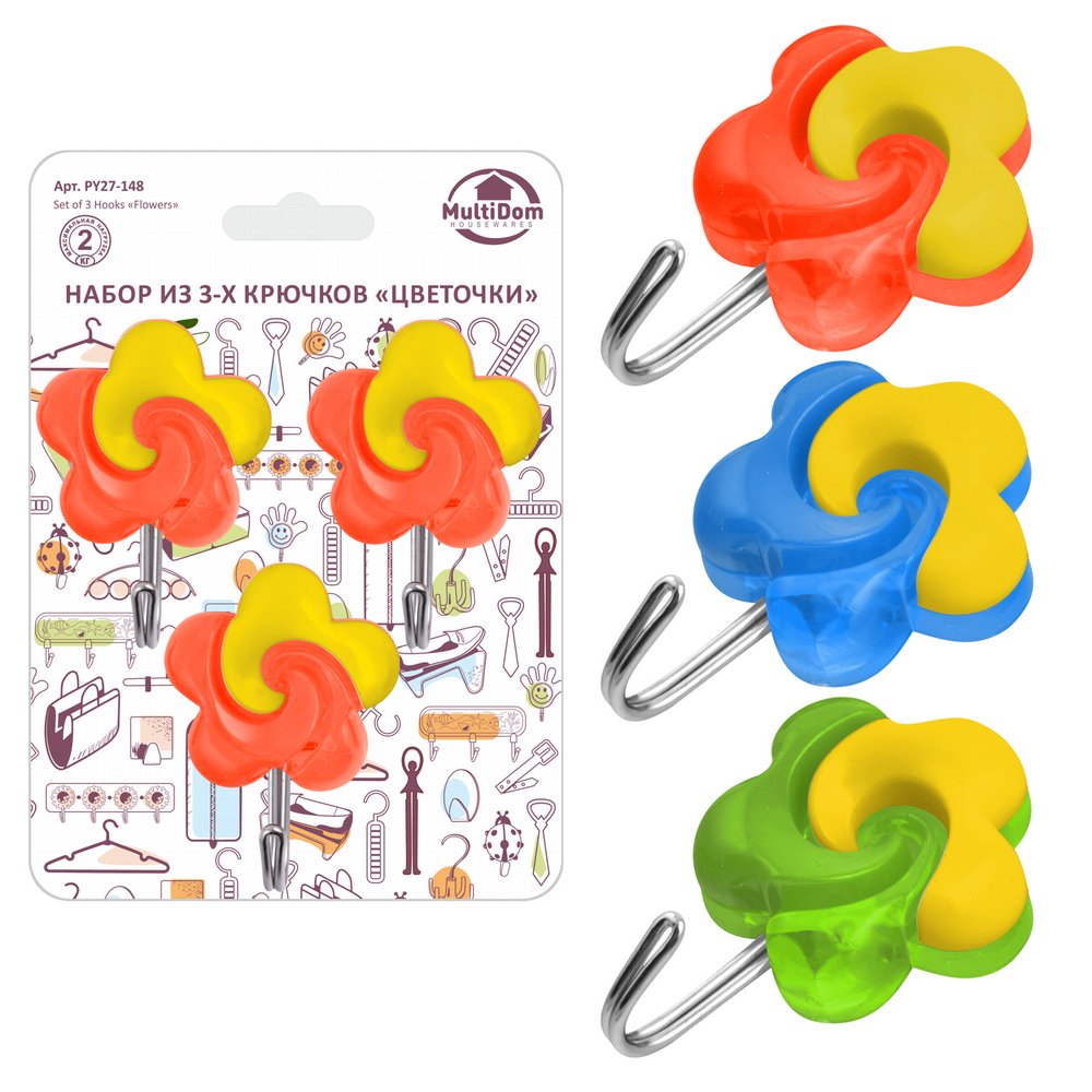 Набор из 3-х крючков "Цветочки" 4 цвета. Материал: Металл, Пластмасса
