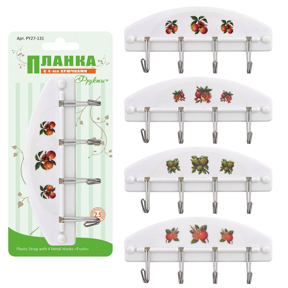 Планка с 4 крючками "Фрукты" 4 дизайна. Материал: Металл, Пластмасса