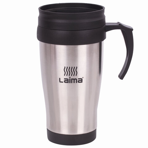 Термокружка ЛАЙМА, 400 мл, нержавеющая сталь, пластиковая ручка, серебристая, 605126