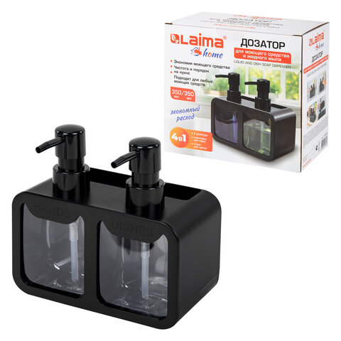 Диспенсер для моющих средств LAIMA HOME – идеальное решение для кухни и ванной комнаты. Сочетая в себе функциональность и стиль, он позволяет одновременно хранить два средства. Легкость наполнения и эргономичность сделают Ваш дом максимально комфортным. Диспенсер для моющего средства LAIMA HOME поможет привести в идеальный порядок Вашу кухню или ванную комнату, а также сэкономить драгоценное время.Экономичный расход, удобство использования и современный дизайн делают этот аксессуар незаменимым помощником в повседневной жизни.Диспенсер выполнен в формате двух объединенных контейнеров из прочного пластика с двумя помпами из полипропилена и нержавеющей стали. Также диспенсер оснащен двумя отсеками для хранения губок и щеток.• Основные характеристики:- размеры: 10х18х17 см; - вместимость емкостей для средств: 350 мл + 350 мл;- цвет: черный;- материал: ударопрочный полистирол/полипропилен.• Основные преимущества:- диспенсер позволяет хранить два средства одновременно;- оснащен отсеками для хранения губок и щеток;- прост в уходе и не боится влаги.
