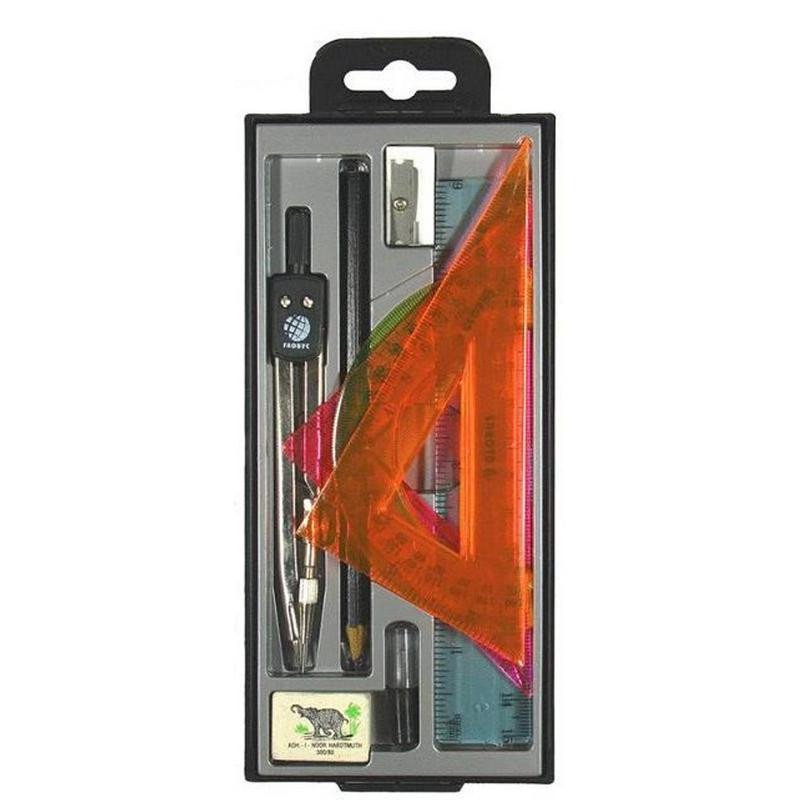 Готовальня «Глобус» (набор для черчения) состоит из девяти предметов - циркуль стальной никелированный (125 мм), пенал с запасным грифелем, карандаш черно-графитный деревянный, ластик резиновый, точилка пластмассовая, треугольник 30 градусов пластмассовый, треугольник 45 градусов пластмассовый, транспортир пластмассовый, линейка пластмассовая. Принадлежности упакованы в черный пластиковый пенал с прозрачной крышкой и подвесом. Набор предназначен для школьников средних и старших классов.