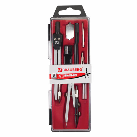 Готовальня BRAUBERG "Architect", 8 предметов: циркуль + кронциркуль, вставки + держатель, отвёртка, точилка, грифель, 210659