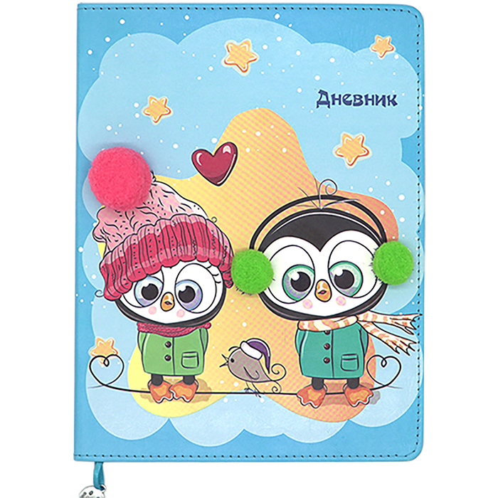 Дневник универсальный, в интегральном переплете 48 листов. Внутренний блок - офсет, плотность 65 гр/м2, размер 165 х 210 мм, прошит нитками. Линовка - светло-коричневая. Блок универсальный, включает 36 учебных недель. Содержит справочный материал по математике, русскому языку, алгебре и геометрии. Форзац с печатью. Обложка - интегральная из искусственной кожи, полноцветная печать, аппликация из пушистых помпонов. Прошивка по периметру. Размер 165 х 215 мм. Скругленные уголки обложки и блока. Ляссе с металлической подвеской смайлик. Индивидуальная упаковка в полибег.