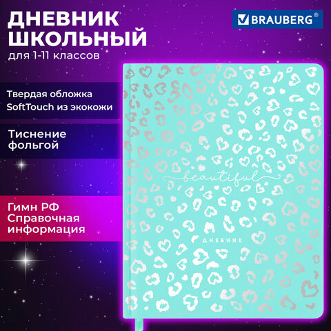 Дневник 1-11 класс 48 л., кожзам SoftTouch (твердая с поролоном), фольга, BRAUBERG, "Leopard", 106576