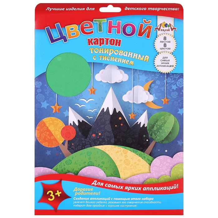 Цветной двусторонний тонированный картон с тиснением 8 листов, 8 цветов ТМ Апплика. В наборе листы тонированного (прокрашенного в массе) картона, на которые нанесено тиснение цветочного орнамента. Цвета: оранжевый, синий, салатовый, красный, черный, желтый, кремовый, розовый. Цветной картон предназначен для создания детских поделок, аппликаций и декорирования. Картон легко режется ножницами, сгибается и клеится. Упаковка - папка с 3-мя клапанами выполнена из мелованного картона. Набор предназначен для детей от 3-х лет.