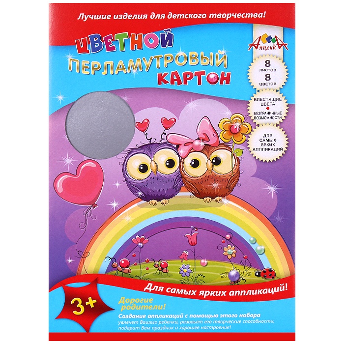 Картон цветной перламутровый А4 8л. 8цв. "Совята и радуга"