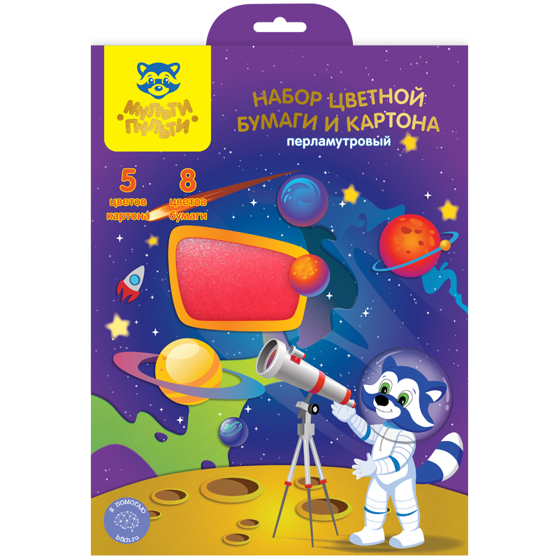 Набор А4 цв. картона, 5л., 5цв., и цв. бумаги, 8л., 8цв., Мульти-Пульти "Енот в космосе", перламутровый, в папке с европодвесом