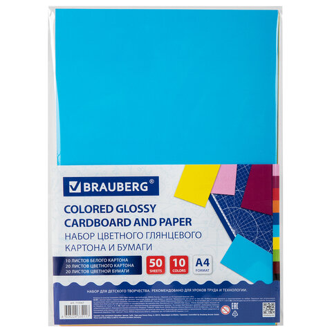 Набор картона и бумаги A4 мелованные (белый 10 л., цветной и бумага по 20 л.,10 цветов), BRAUBERG, 113567