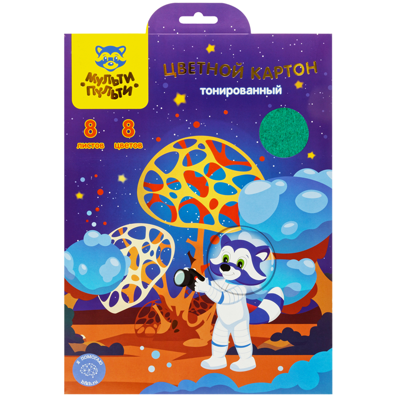 Картон цветной А4, Мульти-Пульти, 8л., 8цв., тонированный, в папке, "Енот в космосе"
