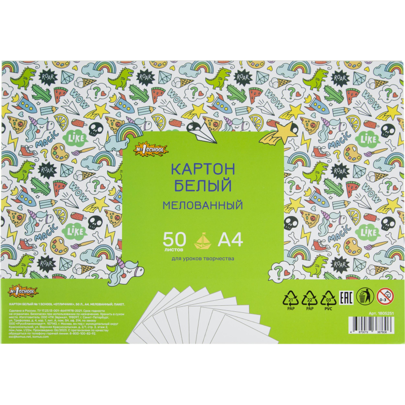 Картон белый №1School 50л, А4 мелованный Отличник, пакет