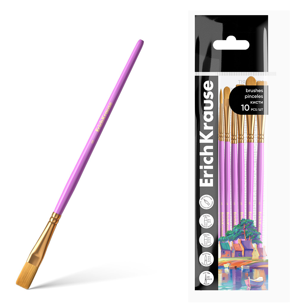 Кисти ErichKrause Art Spirit для рисования и декорирования, синтетика, розовые, 10 штук (в полибеге с европодвесом)