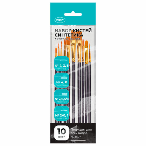 Набор кистей обладает превосходным внешним видом и характеристиками. Он станет хорошим подарком человеку, который увлекается живописью. Упругий синтетический ворс кистей не теряет форму при намокании и имеет повышенную износостойкость. Кисти WBZ изготовлены из высококачественной синтетики. Отличаются универсальностью в использовании, обусловленной упругостью ворса и прекрасными впитывающими свойствами пучка. Ручка из древесины покрыта лаком, что защищает ее от воздействия красок и влаги. В набор входят 10 кистей различной формы. Форма пучка: круглые – № 2, 3, 5; овальные – 4, 8; плоские – № 2, 6, 5/8; лайнеры – № 2/0, 1. Номер кисти соответствует реальной ширине пучка в миллиметрах. Упаковка – ПВХ-пакет с европодвесом.