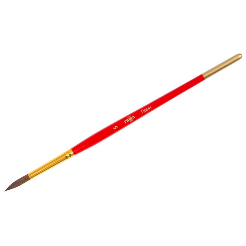 Кисть из волоса Пони, круглая. Волос кисти - средней жёсткости, ближе к мягкому. Волос надежный и долговечный. Идеальны для начинающих художников и детских образовательных учреждениях. Используют для красок: акварель, гуашь. Обойма выполнена из полированного алюминия с золотистым напылением. Ручка изготовлена из качественной древесины березы, покрыта глянцевой эмалью красного цвета.